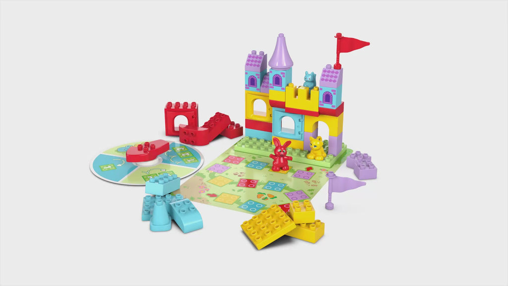 Tu e il tuo bambino potrete trascorrere tante ore di divertimento in famiglia con questo gioco da tavolo 2 in 1 che supporta l’apprendimento dei numeri e dei colori, insegnando loro ad alternarsi. Nel gioco 1, la missione è costruire un castello per Salterello e i suoi amici prima che tornino a casa. Nel gioco 2, la missione è costruire la torre più alta utilizzando i mattoncini colorati.