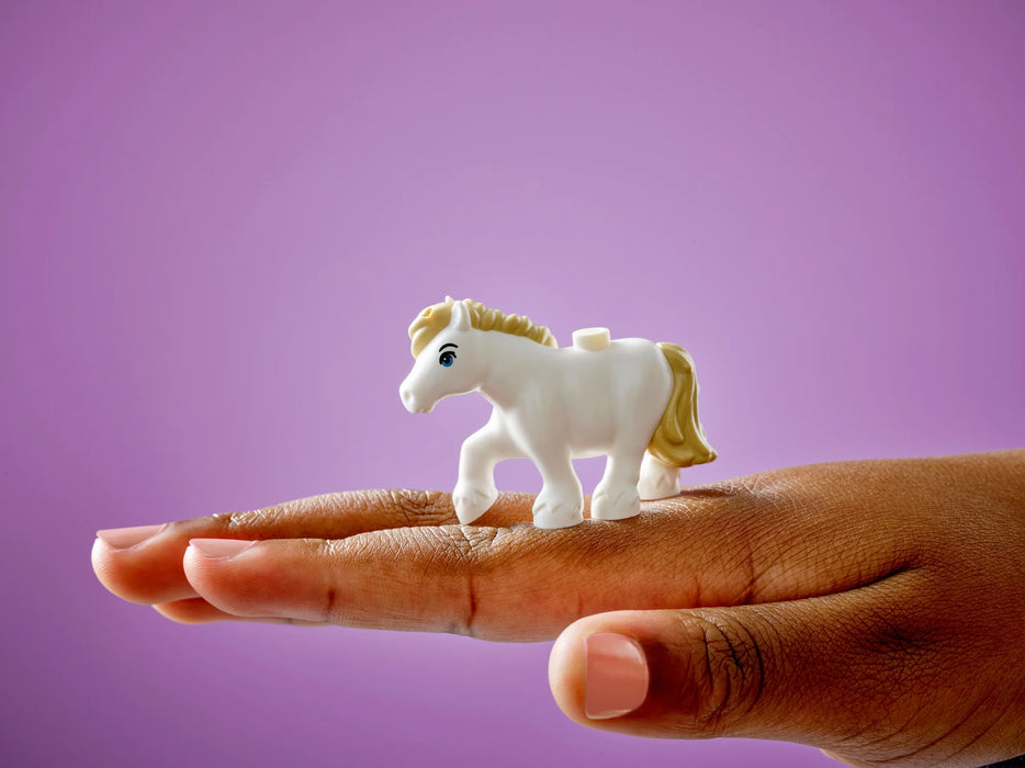 Salta in sella per divertirti con Aliya, Liann, Victoria ed Ella al Ranch e scuderia dei pony di Heartlake City. Gli amici adorano strigliare e dare da mangiare ai 3 pony. Spostare le balle di fieno è molto divertente quando usi l’argano per il fieno. Anche Pluto, il gattino, adora andarci sopra! Al termine della giornata, gli amici si riposano nel fienile ubicato sopra la stalla dei pony.